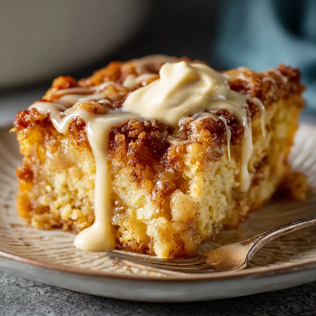 Warm servings highlight the gooey apple layer and buttery topping. A scoop of vanilla ice cream melts beautifully over the cake, creating contrast between hot and cold. Whipped cream adds lightness and visual appeal.