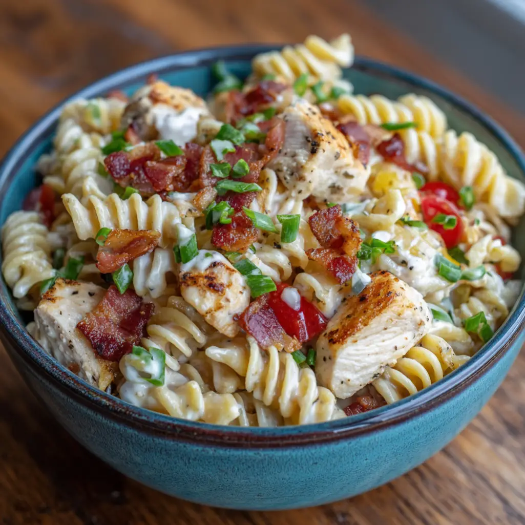 Combine the cooled pasta, chicken, bacon, tomatoes, green onions, and cheddar cheese in a large mixing bowl. Toss gently to distribute ingredients evenly. Use a wide spoon or spatula to avoid breaking the pasta.